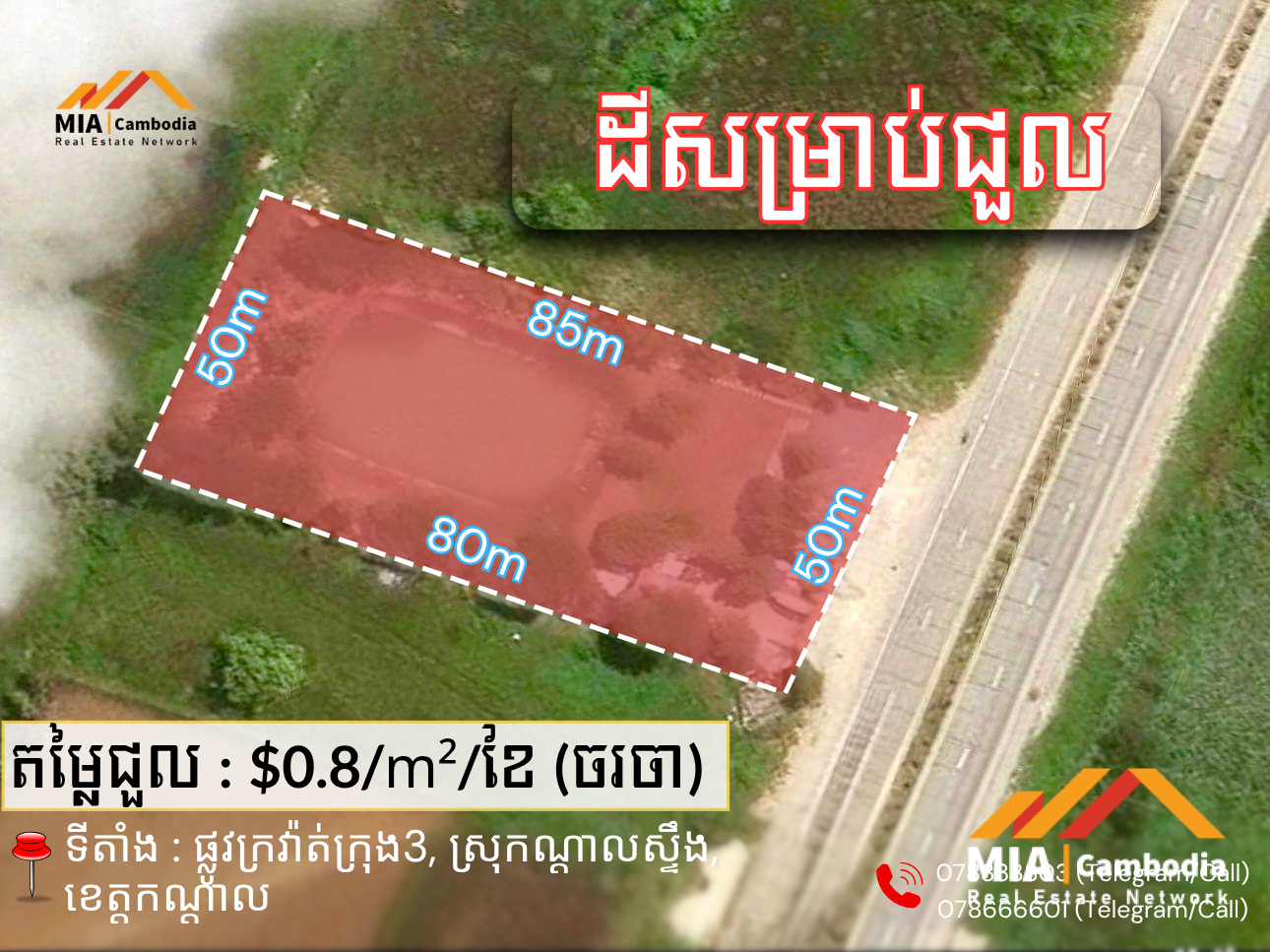 – តម្លៃជួល : $0.8/m²/ខែ (ចរចា)